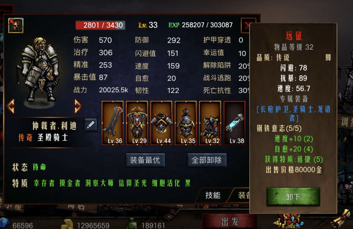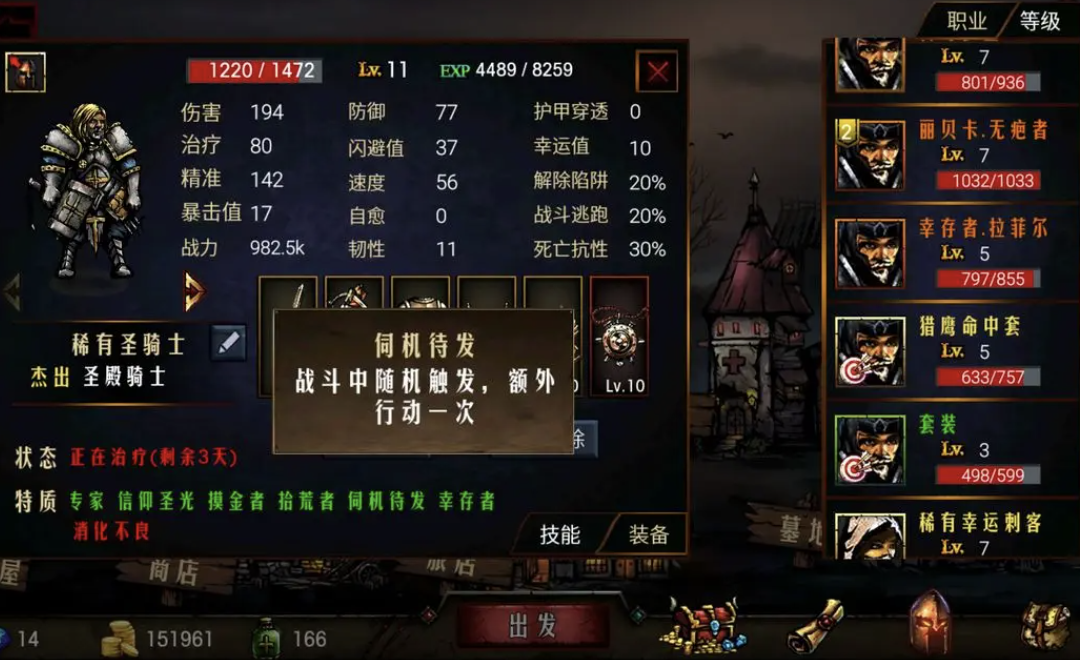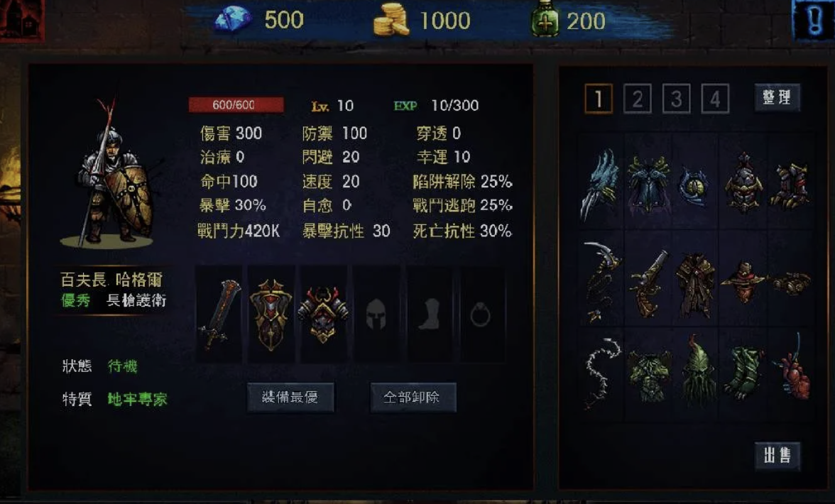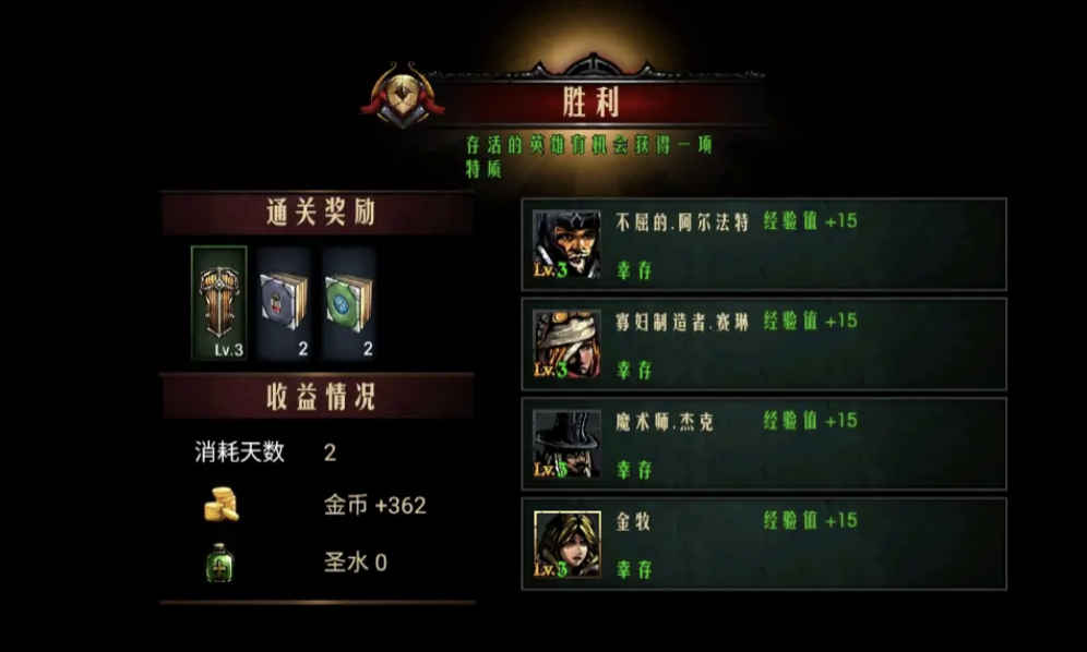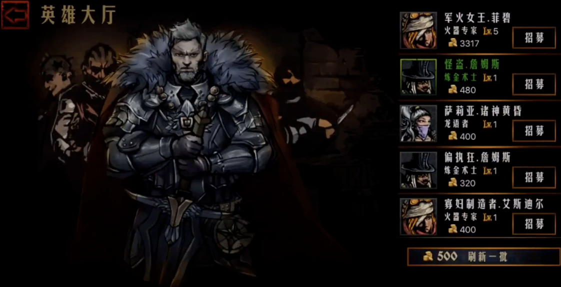 游戏主要玩法设置为地牢主题的生存模式,玩家在黑暗未知的世界可以不断探索,从而找到宝藏提升自己,这里建议新手玩家选择圣骑或者护卫,这两个角色对操作要求不高,但要注意每位英雄都有自己独特的个性,不好好照顾他们还会让他们染上恶习,严重的还会离队逃跑,在一路上玩家在通过实战提升他们能力的同时,还要照顾他们的情绪,人物能力在面板里都有相应的数值,可以直观的看到各种指标。
