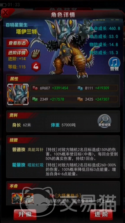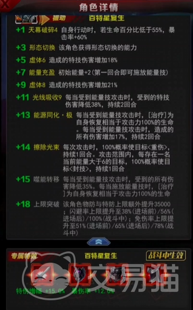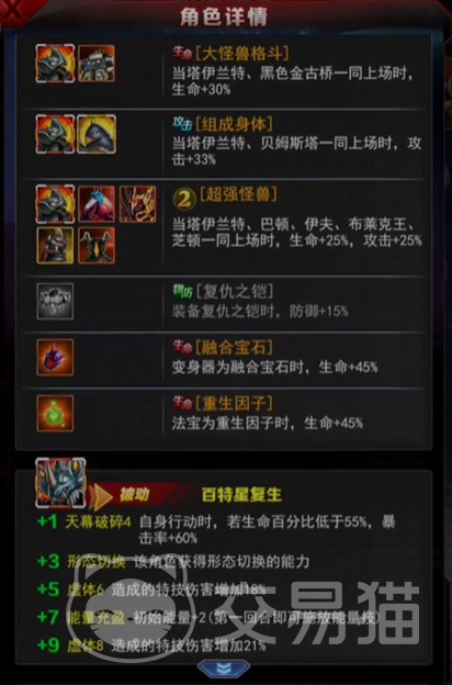 泰兰特在升阶方面,只要升到二阶就可以解锁变身形态,变身后的泰兰特不仅能在第一回合就释放技能,还能对生命值低于55%的敌人造成额外的暴击伤害,相当于一个很强的斩杀效果了,所以在培养泰兰特的时候一定要把它培养到+7以上,最好是满阶,因为满阶以后的特技能够增伤接近30%,能让这个角色的战力得到质的飞跃。
