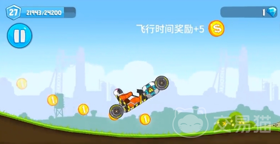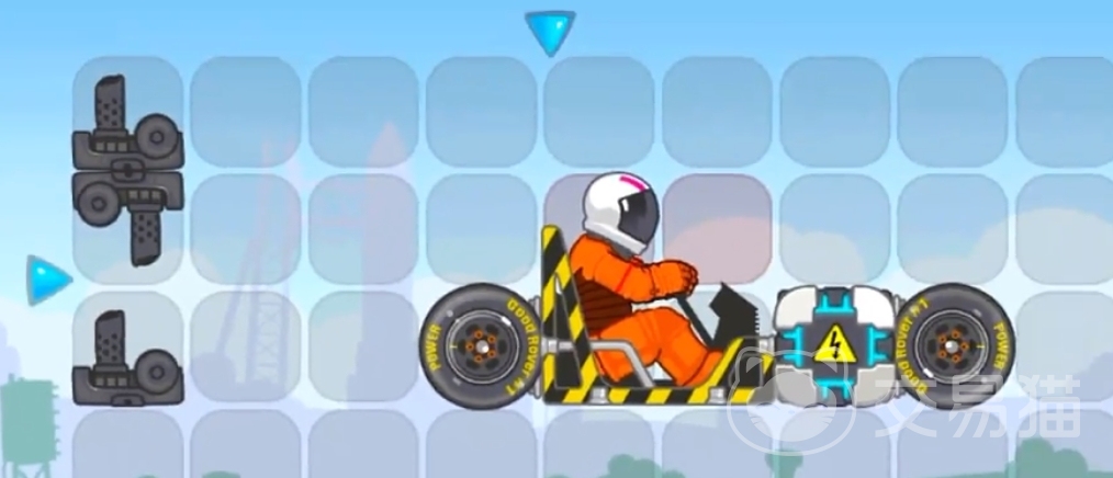 那这个卡丁车在游戏中是否能够有好的驾驶效果。这个车型搭配了电池和两个快速转动的运动轮胎在行驶起来的速度还可以,在遇到高坡起跳时会有翻转,不过只要配合好玩家的操作还是能够平稳着地。在前期的新手村和水星两个星球上是能够轻松过关的。到了后续的关卡上可能就会需要加装涡轮和三脚架来稳固车身。