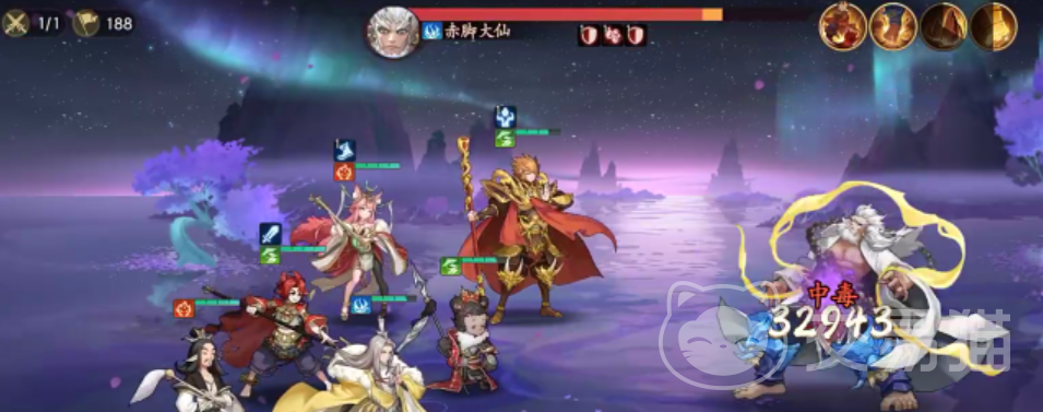 开始游戏后,整体的战斗方式比较简单。但大家要注意好每个角色的技能的释放时机,在不同的时期都有对应作用。与赤脚大仙战斗时,需要先用玉面狐狸的蓄力攻击,即可轻松压低对手的血量。