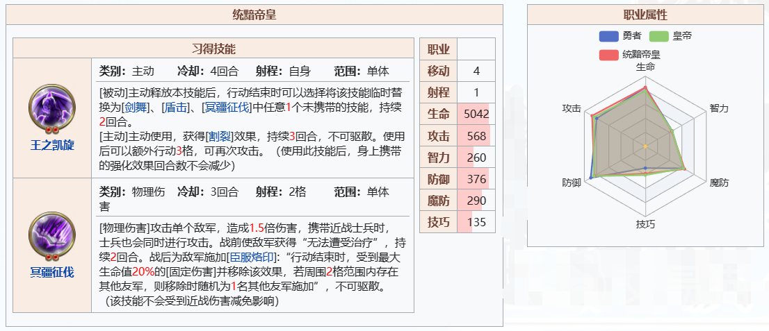 他的核心技能“王之凯旋”允许他在战斗后选择替换技能,这为玩家提供了根据战场情况调整策略的可能,这个技能释放之后可以视战场情况延伸成三个技能:剑舞、盾击、冥疆征伐,这三个技能都是十分有代表性的技能。
