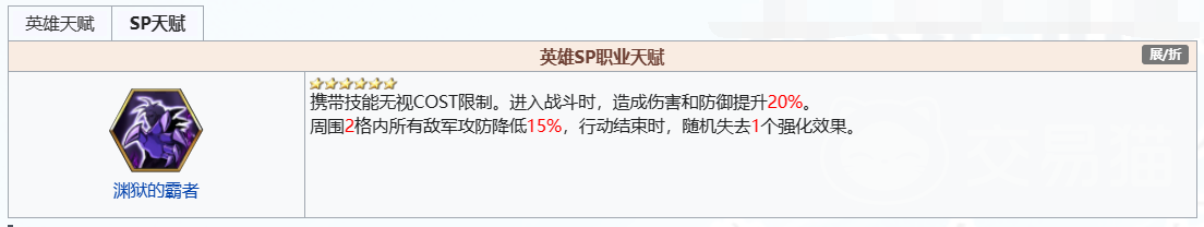 而“渊狱的霸者”天赋,能让他无视费用限制,且攻防两端都带来巨大提升,同时减少敌人抗性,使他在战斗中造成的伤害和防御得到提升,同时降低周围敌军的攻防,这使得他在团队中扮演着重要的角色。