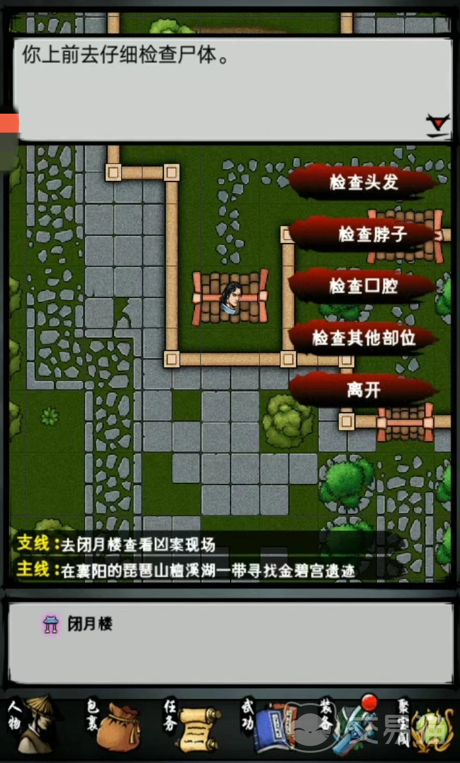 首先要来到烟波楼和老鸨夫人对话,以后获得闭月喽柳烟儿被杀的消息。之后需要来到闭月楼,在这里发现尸体。通过现场勘查之后发现一些痕迹,主要有以下几点,脖子上发现刀口痕迹,刀口上有残留毒物,脖子上还沾有油脂,以及其他部位有钝器击打的痕迹。将发现的尸体带回去,先选择让墨先生验尸,在验尸期间,去洛阳城找一下有可能沾染油脂的地方寻找线索,通过查询npc,在屠夫处发现了线索。