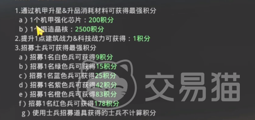 在活动期间,玩家可以按照要求完成任务,就可以得到对应的积分,迅速的提升玩家的排名。先来看建筑升级,一旦在升级建筑之后就可以得到对应的积分,一点建筑战力就可以获得一点积分。