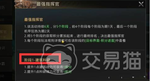 最强指挥官活动一个月一次,每次活动举行期间就会持续6天。整个活动就会分成5个不同的环节,第1个就是建筑升级,第2个是巨兽成长,第3个是士兵特训,第4个是资源采集,最后一个是机甲狂热。