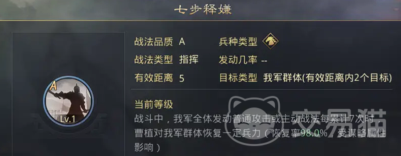 先来看曹植的基本属性和战法。曹植的攻击属性不是他的强项,但他的防御和谋略属性则相对较高。他的主战法“七步释嫌”能够在累计一定次数的普通攻击或主动战法后为我军群体恢复兵力,这使得他在战斗中扮演着重要的辅助角色。而小编推荐直接把曹植在大营位置,通过提供持续的恢复支持来增强队伍的生存能力。