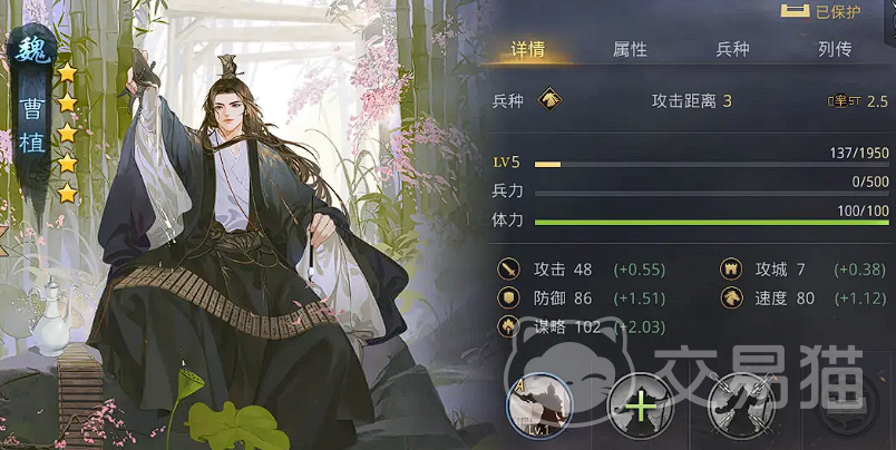 但是如果我们看不足的话,其实也能看出曹植并非没有弱点。他的速度属性较低,很容易在战斗中容易被敌方快速的武将针对。在使用曹植时,需要考虑如何保护他免受敌方的快速打击。一种方法是通过搭配能够提供控制或规避效果的武将,如徐庶或马岱,来减少敌方对曹植的直接攻击机会。另一方面就是靠debuff武将来降低敌方移速了。但总体来看短板还是比较明显了,但至于总体强度就仁者见仁了。