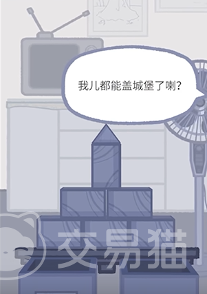 第一关中玩家需要完成一个小城堡的搭建,完成所有的对话之后,拿起积木将画面轻轻向右倾斜,这个时候你会你的父亲正在这里,将手中的积木递给他,父亲便会陪你一起玩耍了,接着进入第二关,这个关卡中母亲会叫你去喝汤,立即丢下手中的游戏去找母亲即可。