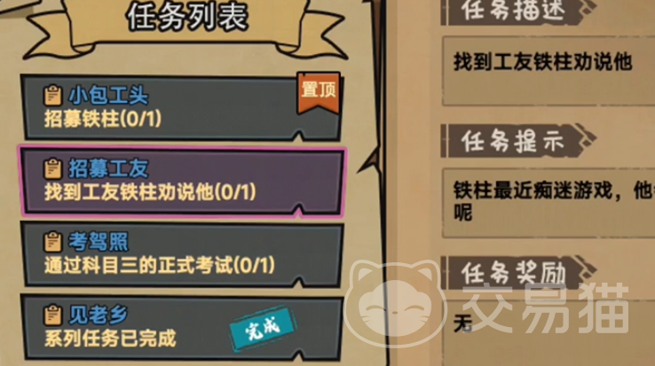 在游戏里如果想当包工头,玩家只能先从最基础的搬砖开始做起,等到搬砖等级提升到精英级别之后,就有机会和理工头聊天,通过兑换能提升和工头之间的好感度,等提升到30之后就可以接收工头发放的专属任务,在这个任务里需要玩家去找三名工人,找到这三名工人之后,玩家就可以直接进生成包工头。