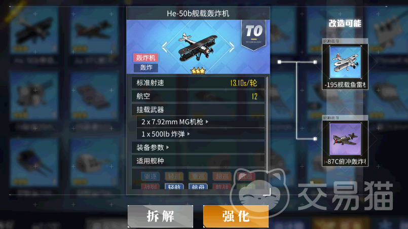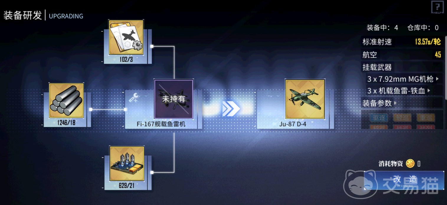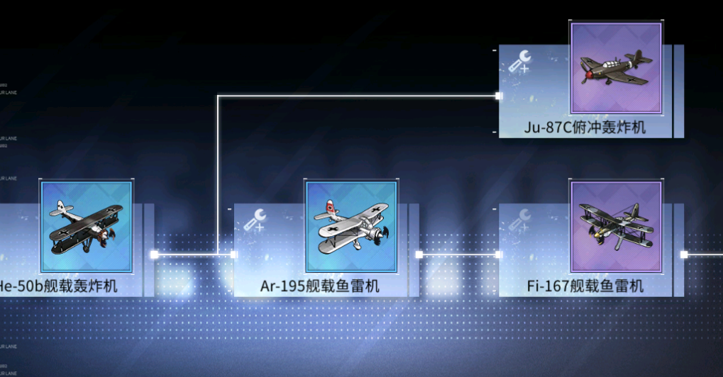 Ju87d4是铁血阵营的鱼雷机,俗称斯图卡,目前只能通过装备研发系统来合成,而合成它需要先合成出它的前置鱼雷机“Fi-167舰载鱼雷机”。Fi167则是用蓝色的“Ar-195舰载鱼雷机”合成的,然后Ar195则是要“He50b舰载轰炸机”来合成的。
