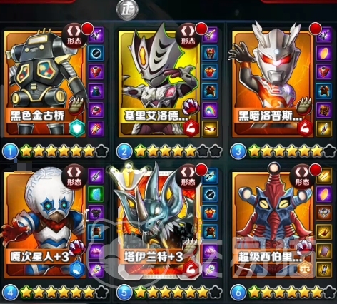 ②黑色金古桥+基里艾洛德人+黑暗洛普斯赛罗+嘎次星人+塔伊兰特+超级西伯利特星人:这套阵容是比较罕见的邪恶阵容,构成阵容的角色都是反派的怪兽,首先前排第一位黑色金古桥既能打直线伤害又能打全屏伤害,并且大招还能扣敌人两格能量,显著拖慢了对手的大招启动。而前排第二位基里艾洛德人则自带免伤,并且同样能扣除敌人能量,而且扣能量的同时还能增加自身的破挡率,第三位前排黑暗洛普斯赛罗也有扣能量的手段,三者结合之下对手前面回合等于只能普攻。
