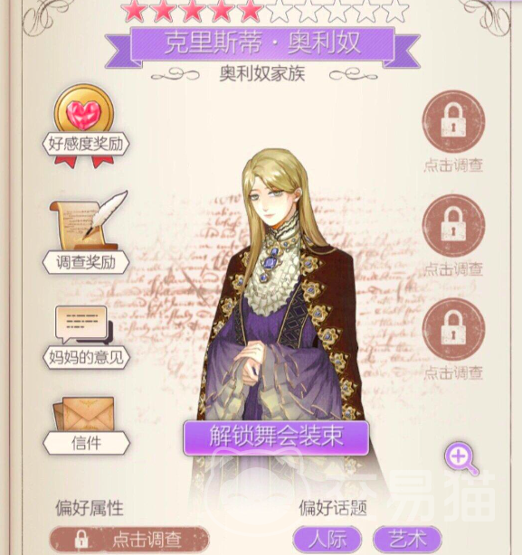 克里斯蒂是一位公爵夫人,其主要属性为水属性,势力所属为奥利奴家族。首先来看一下服装选择,要想激发起这位公爵夫人对你的好奇和好感,可以选择素雅成熟的服装饰品进行穿着。这种着装属性可以说是非常符合这位公爵夫人的审美,在衣柜当中这种类型的服装饰品还是非常多的,具体的选择可以根据玩家的个人喜好。
