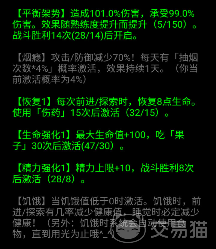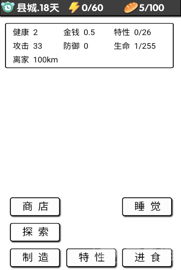 来到县城的时候遇到黑色太刀男子建议直接买下,这是全局唯一一个可以用钱刷等级的阶段。煤老板每次攻击也会偷钱,打死之后多获取一块。如果遇见有收药的npc一定要去看看,一般在这里会刷新出好东西。在县城达到第42天后就无法再探索了,只能前进或者是睡觉前进。