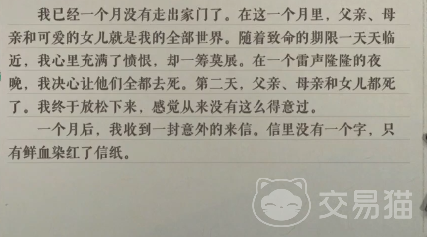 关卡的题面是主人公已经有一个月没有走出家门了,在这一个月的时间里,父母和女儿就是我的全部,随着日期的到来,我除了愤恨以外却什么都做不到。之后来到一个雷雨夜,我决定让父母和女儿都去死,之后我就变得轻松了起来。直到一个月后,我收到一封用血染红的信件。