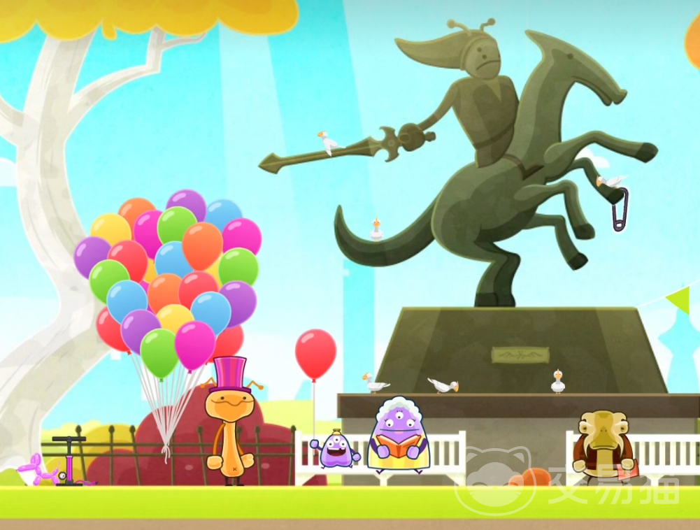 接下来两个关卡难度都不算高,之后来到第六关,此关我们来到一个游乐园,一开始我们直接往右走,看到一个标牌的时候记得停下来看一下,之后来到下一个场景,这个场景首先需要去翻垃圾桶,拿到两个道具。然后返回上一个场景将拿到的气球给打气装好。然后使用跷跷板将上面的家伙给砸下来。我们便可以爬上去去抓住下面那只鸟了。