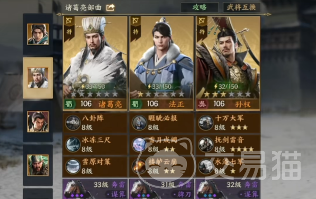 大佬可以是司马懿+诸葛亮+田丰的组合,平民玩家则可以考虑用孙权+法正+田丰/李儒的组合。法爆队友很多技能诸如彗星、奇迹这些可以让你的法术暴击法术伤害提升很多。不过在前期这些属性还没堆起来的时候也是不算是很厉害的,但玩这种SLG游戏主要还是看成型后的强度,最终成型的法爆队在游戏里称得上是T0组合。