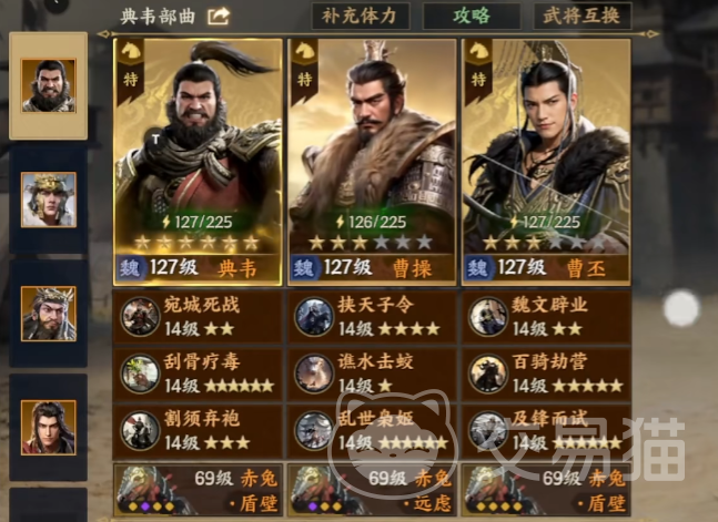 骑盾组合有很多,不如说五子骑,曹丕的羁绊盾骑,还有曹操盾骑,可以根据自己所拥有的武将来做适当调整。以曹操盾骑为例,是开荒优先级最高的队伍,曹操于禁曹丕,这三个武将组成的骑盾是目前最热门的,如果缺少其中一个也可以换成典韦、郝昭之类的。