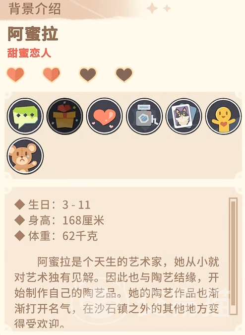 上面这些便是关于沙石镇时光阿蜜拉喜欢什么的详细介绍。如果玩家们想要提高阿蜜拉这位角色的好感度的话,那么便可以按照上文所说的物品进行赠送,这样便可以最快速度的提高她的好感。