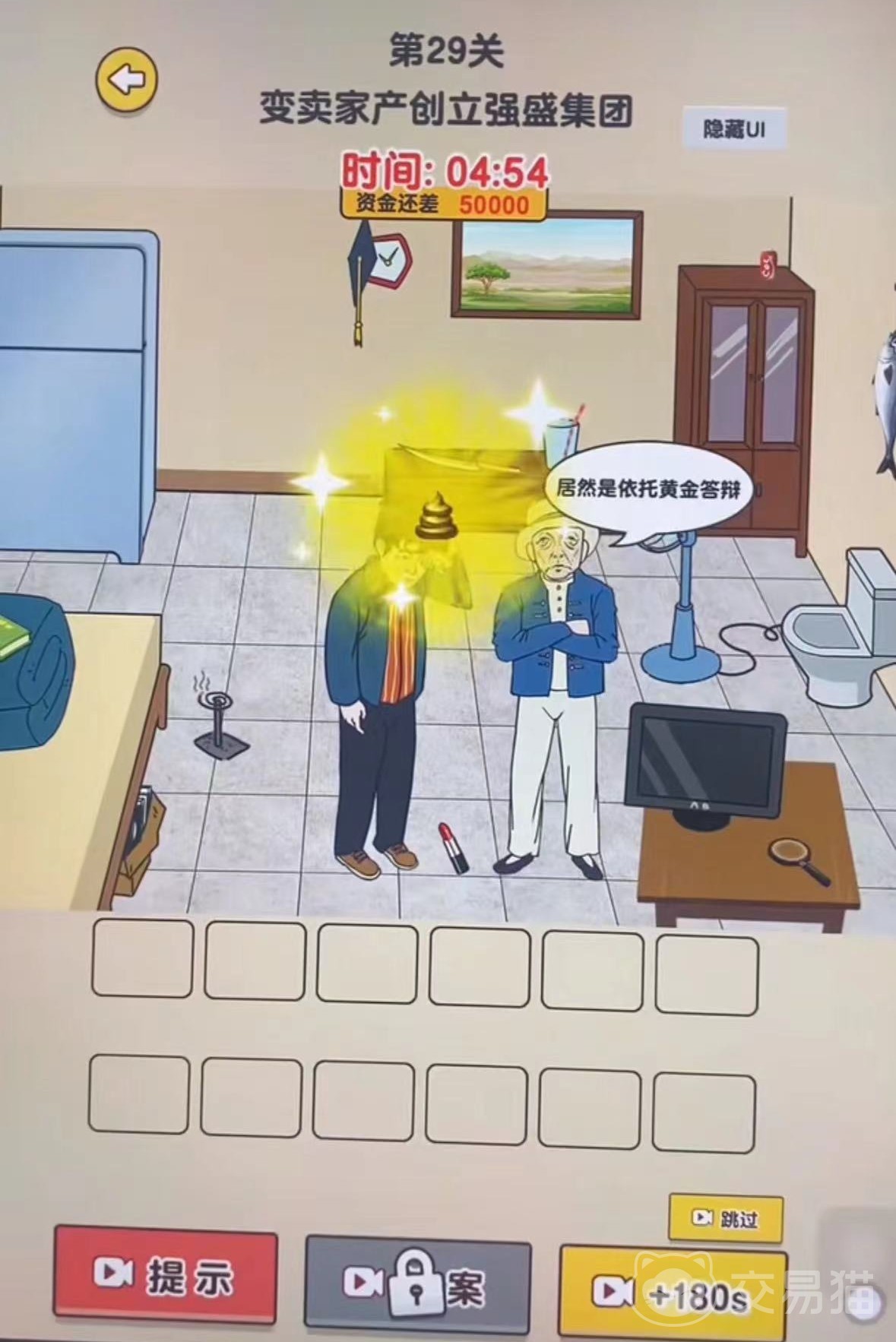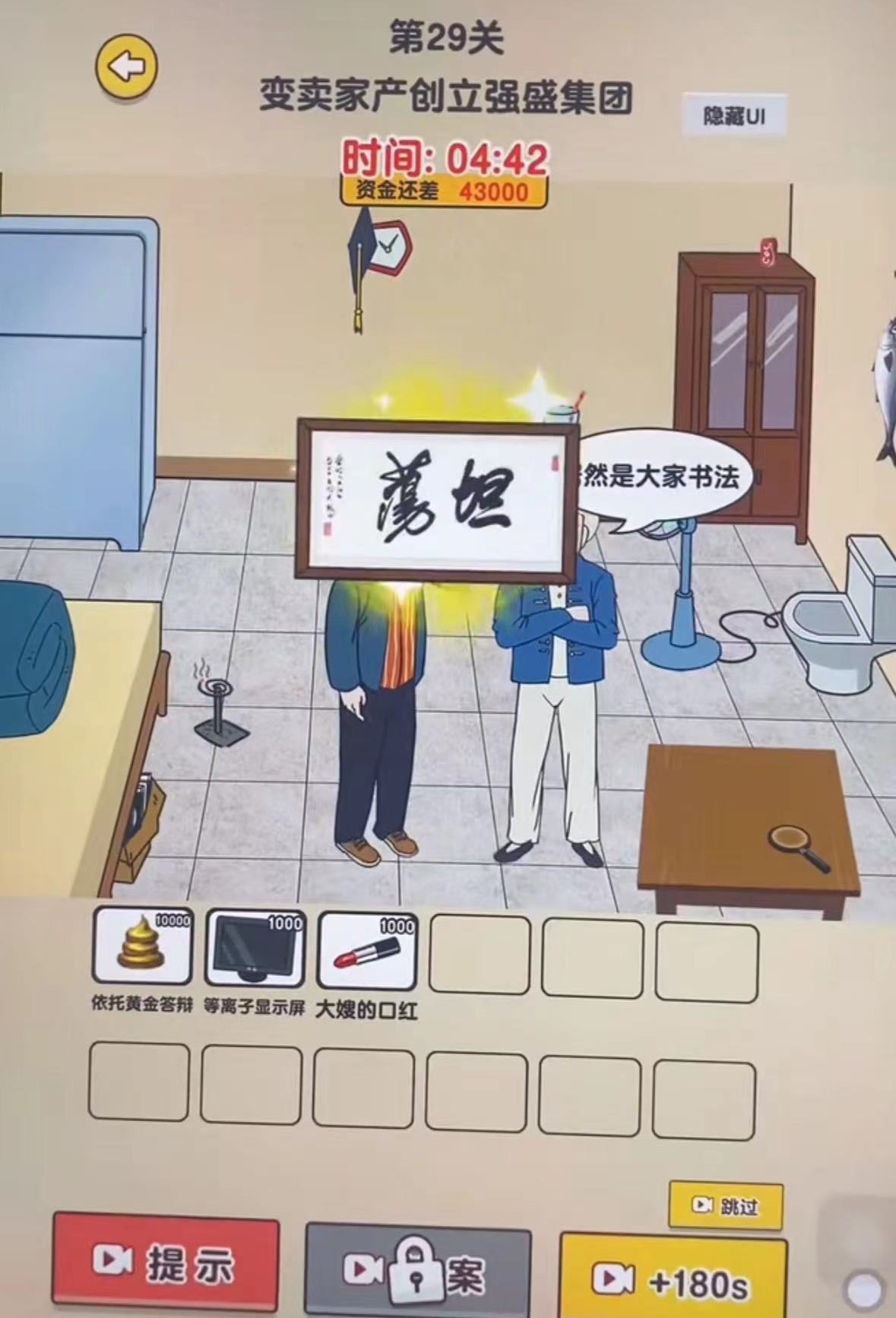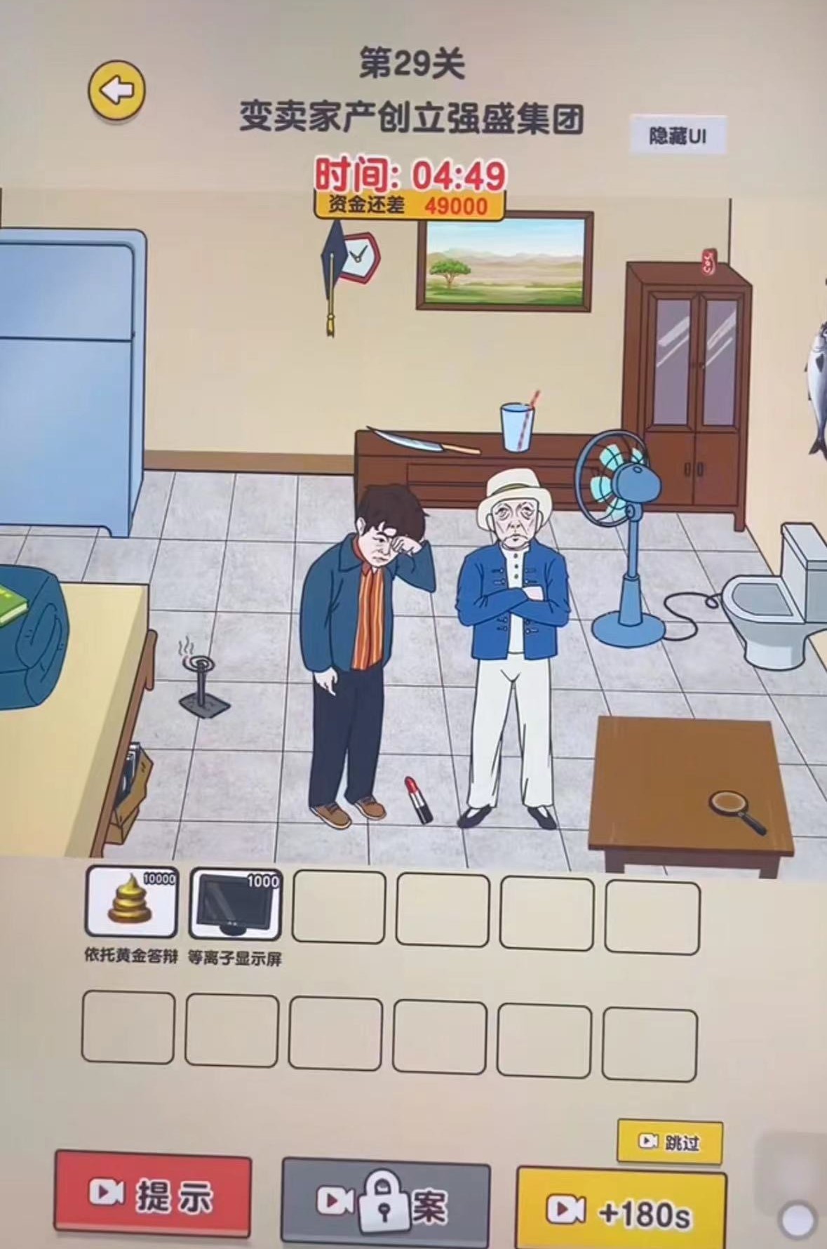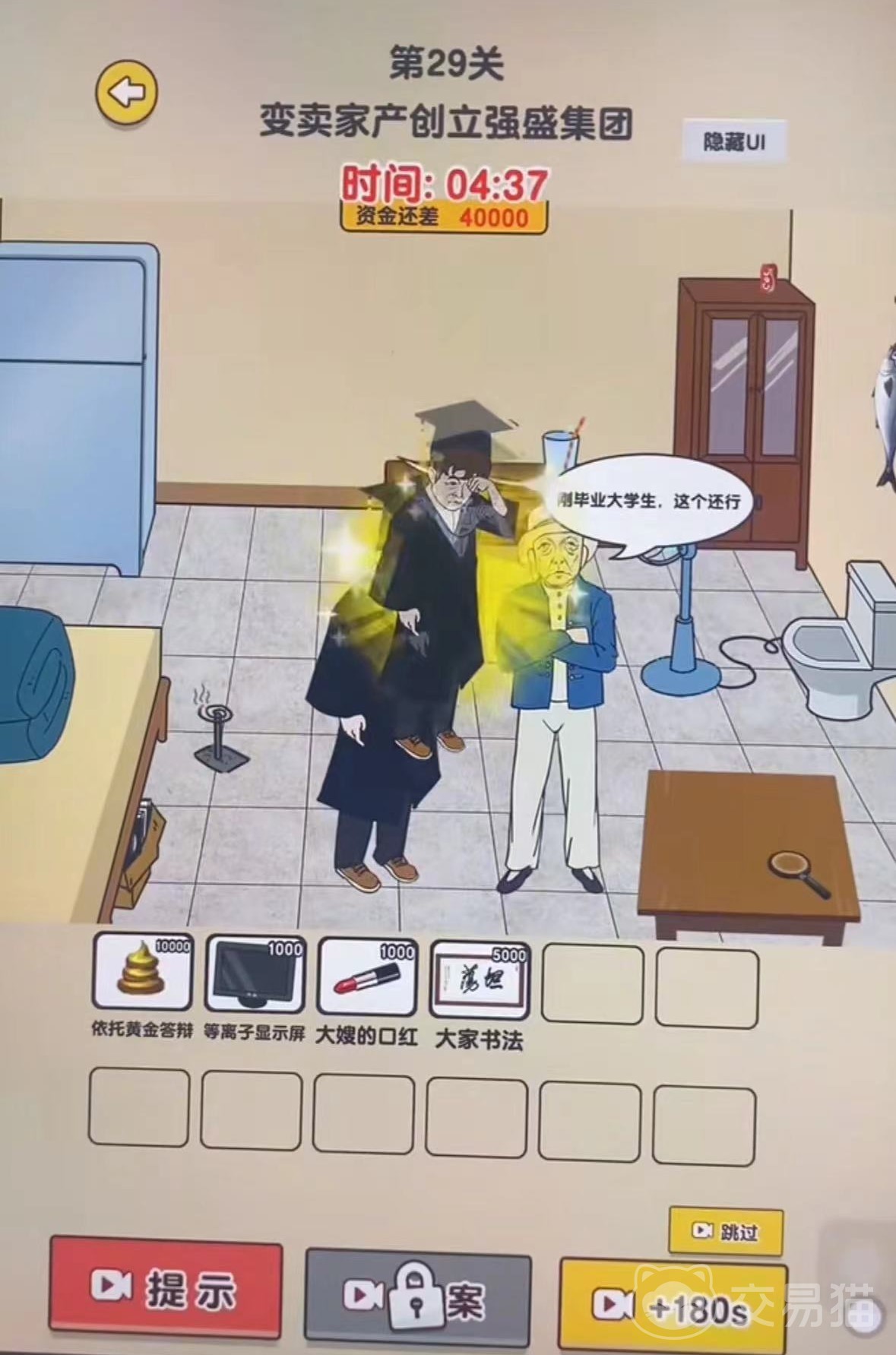 9、点击显示屏和唇膏会变成资产,再点击墙壁挂着的学士帽戴到强哥头顶就变成打工族;