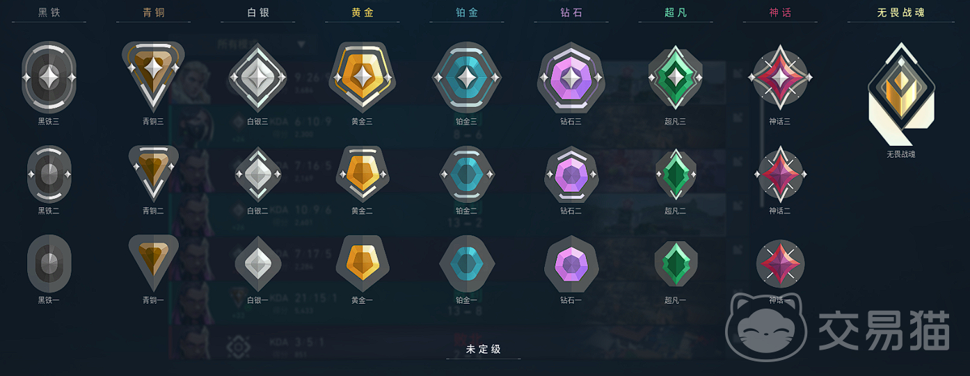 无畏契约的段位系统它包含了八个主要等级,每个等级又细分为三个小段位(战魂只有一个小段)。从低到高这些段位依次是铁、铜、银、金、白金、钻、神话、耀光。以及最顶级的无畏战魂。玩家在完成一定数量的对局后,可以通过定级赛来确定自己的起始段位。定级赛的表现,包括击杀数、助攻、支援等综合数据,将决定玩家的起始段位。而其中的三小段为就分别是上文提到过得1-3段位,1段最低,三段最高。