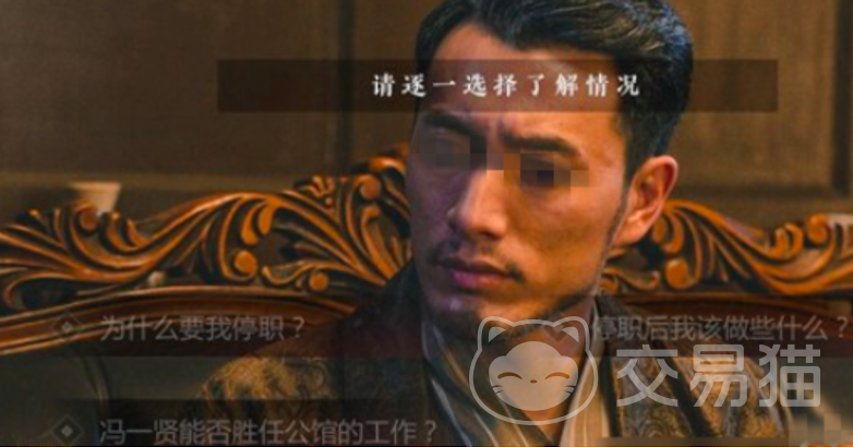 在接下来的剧情当中小编也截了一张图片,对于“为什么要我停职”,“停职后我该做些什么”以及“冯一贤能否胜任公馆的工作”,这几个问题都要点一下,方便玩家更好的了解剧情,以便后期的选择。