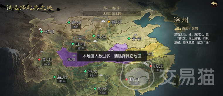 第二个推荐的地区是徐州,因为徐州选择的人比较少,因为人多的洲资源肯定相对会紧张,新手玩家可以先选择徐州通过完成一些日常的任务和副本的任务来获取一定的收益,如果在徐州战斗的话也能得到丰富的奖励,因此徐州也非常值得选择。