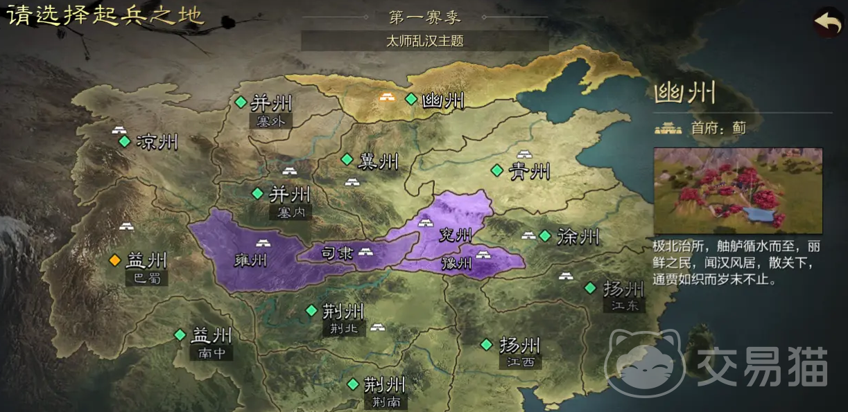 第三个推荐的地区是幽州,这个地区的位置比较偏远,新手玩家可以先在幽州发育,而且还有非常充足的时间去探索游戏的玩法,虽然目前有很多玩家觉得幽州好导致选择幽州的人变多,但依然是个适合新手玩家的地区。