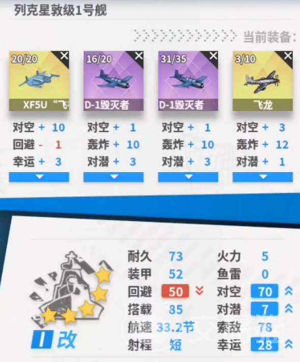 她的回避率只有30,这点可以用装备进行弥补。对空的能力是37,因为是航母,所以对空的能力还是有一些的,搭载的数量则是80。航速则是33.2。索敌的能力是42,射程属于比较短。