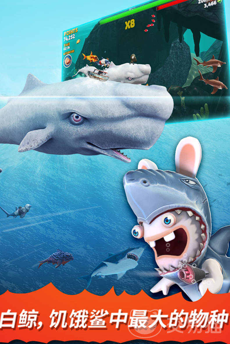 饥饿鲨进化不仅仅是个简单的吞噬游戏,它还拥有丰富的进化系统。玩家的鲨鱼可以通过吃掉更小的鱼群和其他海洋生物来成长。随着鲨鱼的成长,它们可以解锁新的技能和进化成更强大的形态。这个进化过程不仅仅是外观上的变化,还包括技能和能力上的提升。鲨鱼可以学会更快速地游动、更强力的咬合力量,甚至获得特殊能力,如发射电击甚至是毁灭管线,来一举击败地方boss。