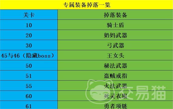 下表就是所有会掉落专属装备的关卡,玩家要想让自己的队伍实力更强,可根据所选的职业,去相应的关卡里进行刷取。只不过这些专属装备在爆率上有些感人,因而很难一次性将它们刷取到。好在所有的关卡均能重复被玩家挑战,并非是通过关卡后就不能返回该关卡刷怪,所以玩家可多尝试几次,用刷关数来弥补专属装备掉落的概率。