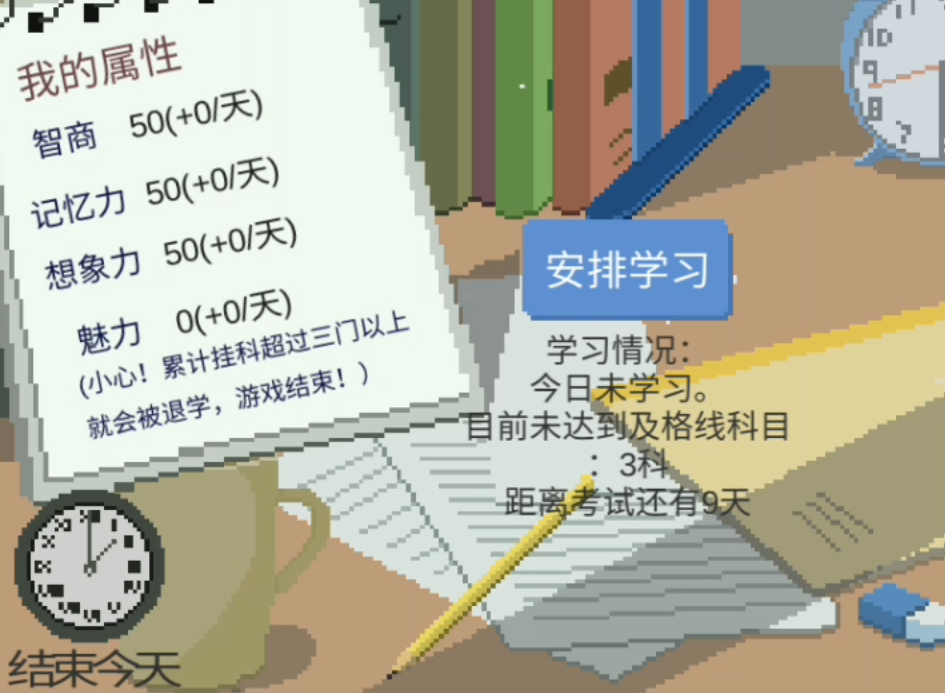 在游戏的一开始我们需要进行角色选择,目前因为版本没更新的缘故,所以我们可以选择的角色只有皮皮这一个。他是一名土木工程的学生,很喜欢玩游戏。之后我们便可以正式进入游戏。在刚进入的时候我们的状态栏都是满的。基本的属性并非很好,除了魅力是0以外,其他都是50,目前因为我们的学习能力有一些低,如果不学习的话,那么我们有3门课会出现挂科的风险。所以需要尽快学习,现在我们先去确认手机,里面有一条信息,是我们的母亲发来的。