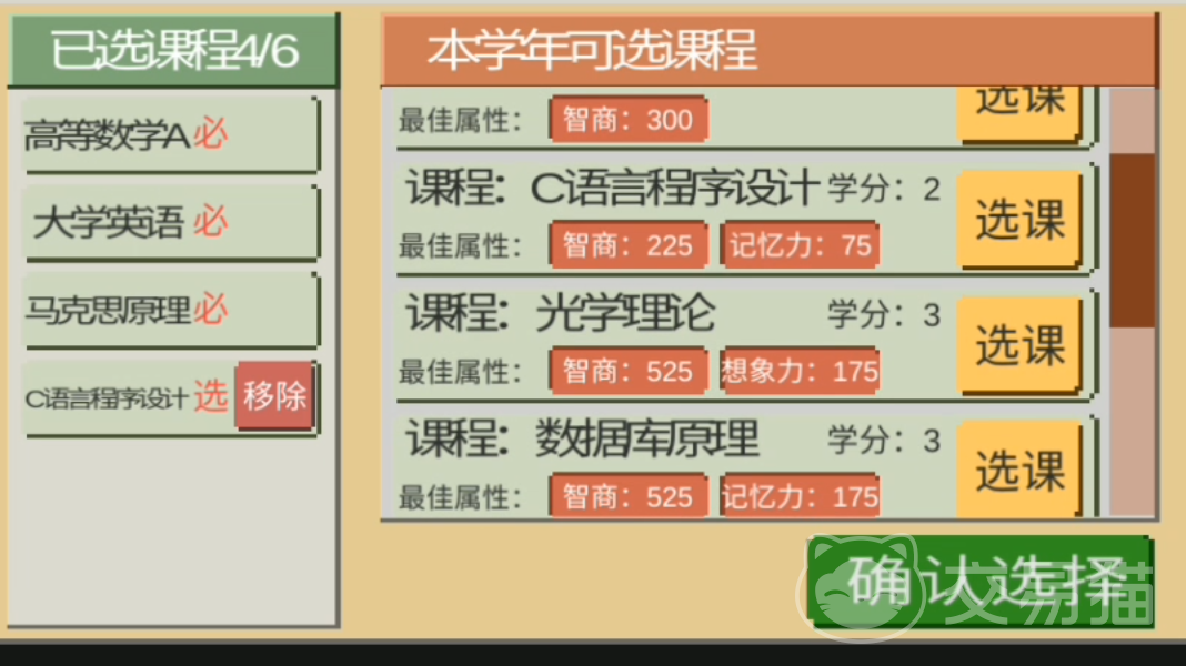 大致的意思是上了大学后需要自律,然后给了我们800的生活费。之后我们先打开电脑,然后进行选课。我们可以选择一个C语言的程序设计,一个数据库原理,以及一个光学理论。再加上原本的4个必修课程,我们本学期的课就是如此了。之后我们可以出发前往湖心公园,玩家先选择和最右边的大叔进行对话。这样我们便可以让自身的智商提高50,但是心情会减少5。这个大叔我们需要反复刷三次,这样智力会得到150的提升。
