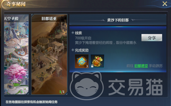 第二个难度较高的密文任务是黄沙下的旧都。线索提示比较明确,“黄沙下掩埋着曾经的辉煌,裂谷中藏着永久”。在等级要求方面,玩家需要达到700级才能开启,触发条件也比较简单,在完成救都诺亚的主线任务后,可以前往救都诺亚的中央大厅逛一逛,触发这项秘闻任务的概率就会大大提升。在触发该任务后,同样可以开启自动跟踪模式,对于很多新手来说还是比较友好的。