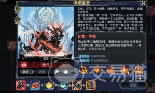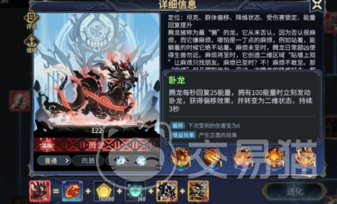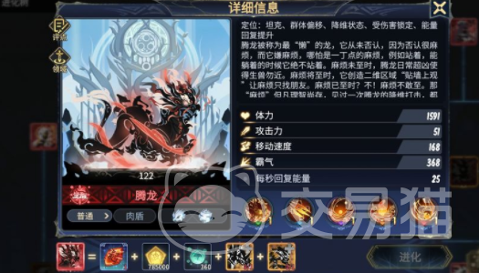 想要培养腾龙,需要先了解一下这个角色的基本信息,游戏里腾龙的定位是一个坦克,所以在战斗的时候可以作为肉盾放在队伍的最前排承担伤害,这种特性让成龙的血量非常高,攻击能力较弱,但是移动速度是比较中等的,玩家可以把这个角色当成一个纯肉盾的辅助角色。