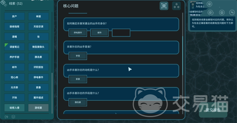 在游戏中,玩家应仔细阅读每个角色的笔录,注意细节变化,如线索位置的更换和密码的变动。特别注意游戏室中的线索,以及破解铁箱子密码后新增的录像带线索。利用游戏提供的进制转换器和运行日志功能,可以帮助玩家更快地锁定嫌疑人。