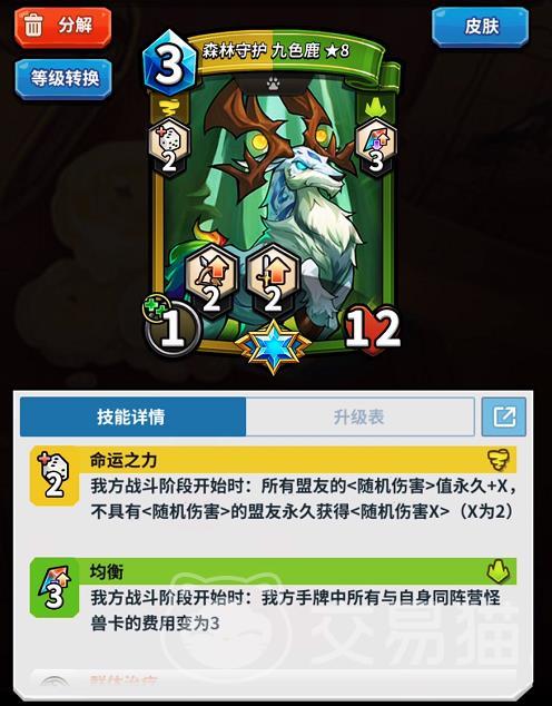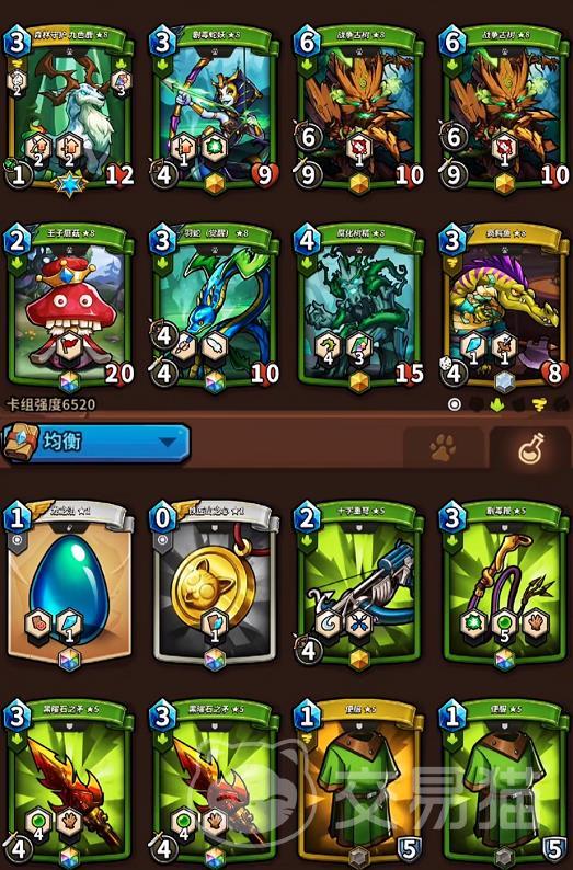 均衡流整体的平滑度很不错,怪兽牌为森林守护九色鹿、剧毒蛇妖、战争古树(2张)、王子蘑菇、羽蛇、腐化树精、疯鳄鱼,装备牌的选择比较灵活,其中龙之泪、黑曜石长矛(2张)、便服(2张)必带,剩下三张装备牌可选铁匠山之心、十字重弩和剧毒鞭。