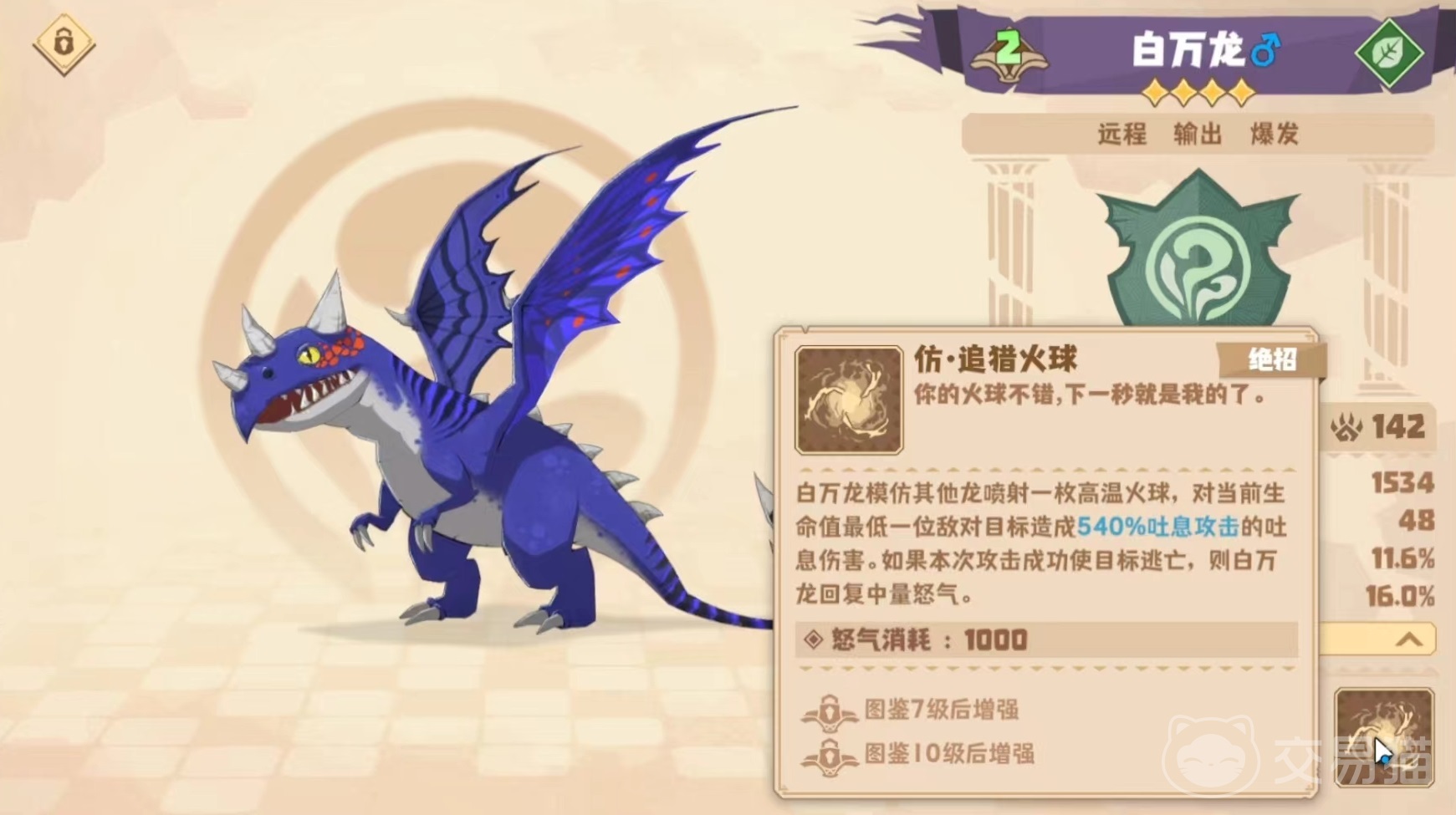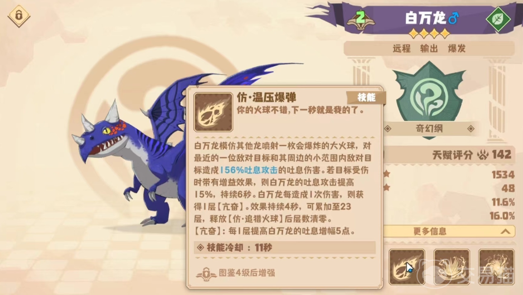 接下来是白万龙,擅长进行爆发式远程输出,第1个技能模仿其他龙喷射普通火球造成吐息伤害。第2个技能模仿其他龙喷射出爆炸大火球,对距离最近的敌方目标及其周围小范围内的敌方单位造成吐息伤害,并附带溅射效果。如果目标受伤的技能有额外增益,使百万龙的吐息攻击提高,另外白万龙每造成一次伤害,自身就能获得一层亢奋状态,亢奋能够叠加到23层,当释放追猎火球后清零,每一层亢奋都能提高5点吐息增幅。