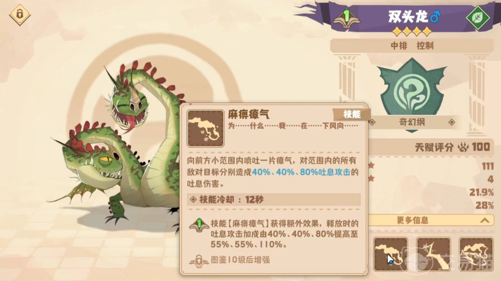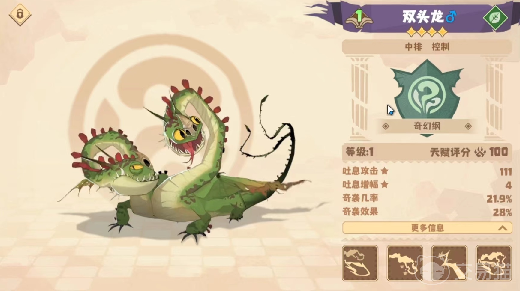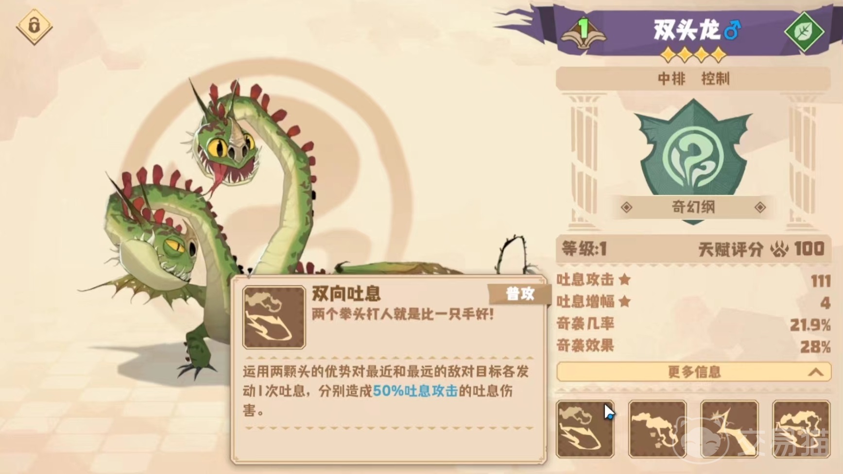 因为数量比较多,所以小编只能选其中比较重要的给大家介绍。首先是双头龙,这是一个很好的中排控制角色。第1个技能双向突袭,可以利用自身两个头的优势,对敌方最近和最远的目标发动一次突袭攻击造成伤害。第2个麻痹瘴气,向前方小范围内喷吐出一片瘴气,所有范围内敌方目标都会受到吐息伤害。第3个火花爆闪,向最近的一名敌方目标发射带电火球,使对方眩晕长达两秒钟,还能造成高额吐息伤害。第4个幽火龙卷,将自身两颗头扭曲起来,利用火焰将瘴气引燃,形成灼热的火焰龙卷风,对其中范围内的敌方目标造成高额伤害,另外每次攻击还能降低对方的怒气。