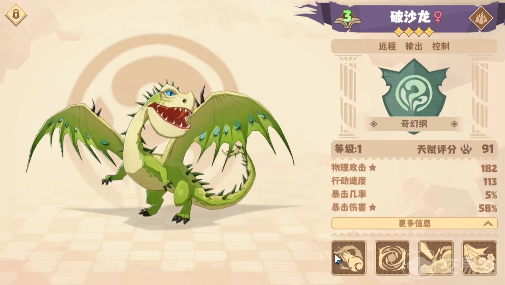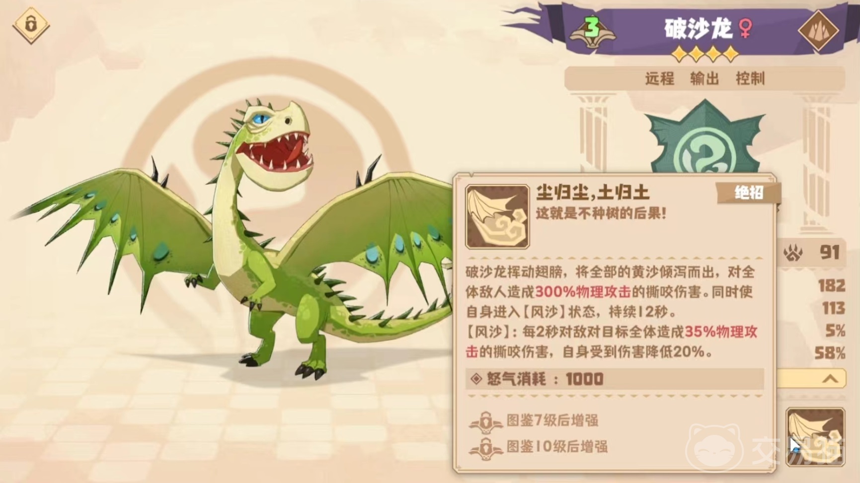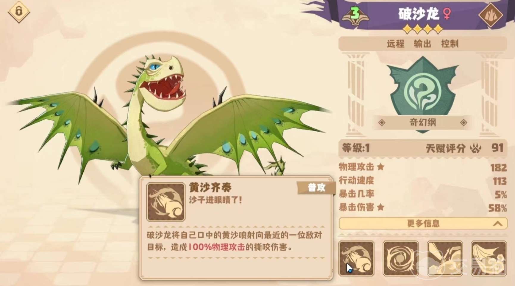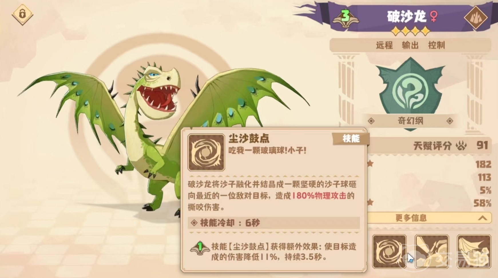 破沙龙属于奇幻纲龙类,自身擅长远程输出,还有一定的控制效果,能够操纵黄沙打出一系列技能效果。第1个技能黄沙齐奏,将口中黄沙喷向距离自己最近的敌方目标,造成撕咬伤害,按照攻击力100%计算。第2个技能沙沉沙鼓点,将沙子融化成结晶,并形成一颗沙子球,砸向距离自己最近的一名敌方目标,造成撕咬伤害,另外该技能还有额外效果,能使目标造成伤害降低。