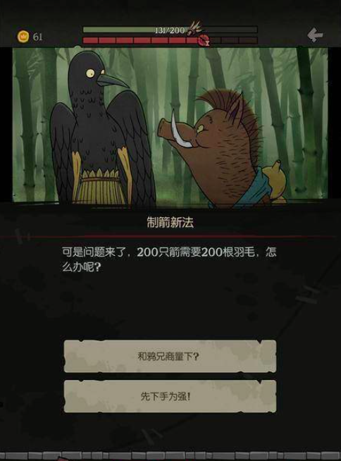 在制箭的过程当中你又会发现做箭需要两百根羽毛,此时就需要找到我们的鸦兄,面对着眼前的这两个选项,反正无论选哪一个都要拔他的毛,所以玩家随便选一个就好啦。