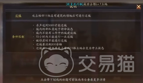 城内的所有队伍全部都需要下掉。需要保证城内并没有一些正处于升级状态的建筑,需要保证在迁城时并没有处于冷却的状态。金铢应该超过500,在满足这几个条件之后就可以完成迁城。如果没有满足,则意味是无法迁城的,这点玩家需要知道。