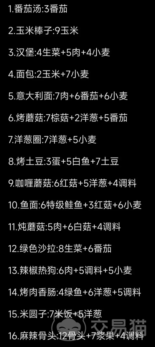 食谱方面小编推荐几个比较有代表性的:混合果汁:需要2个西瓜和2个苹果来制作。它可以为玩家提供快速的能量恢复,非常适合在探索过程中快速补充体力。