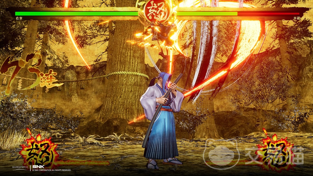 然后就是进阶一些的闪避与破防的招式了,闪避的动作是弱斩+中斩,而破解防御则需要靠近对手,他的组合是 ← or →+强斩+脚踢,大家还可以使用偷袭技巧组合中斩+强斩,对手如果想要对你发起进攻,小伙伴们可以在对手攻击命中的前一刻进行防御触发看破,然后在看破成功时使用弱斩+中斩进行还击。