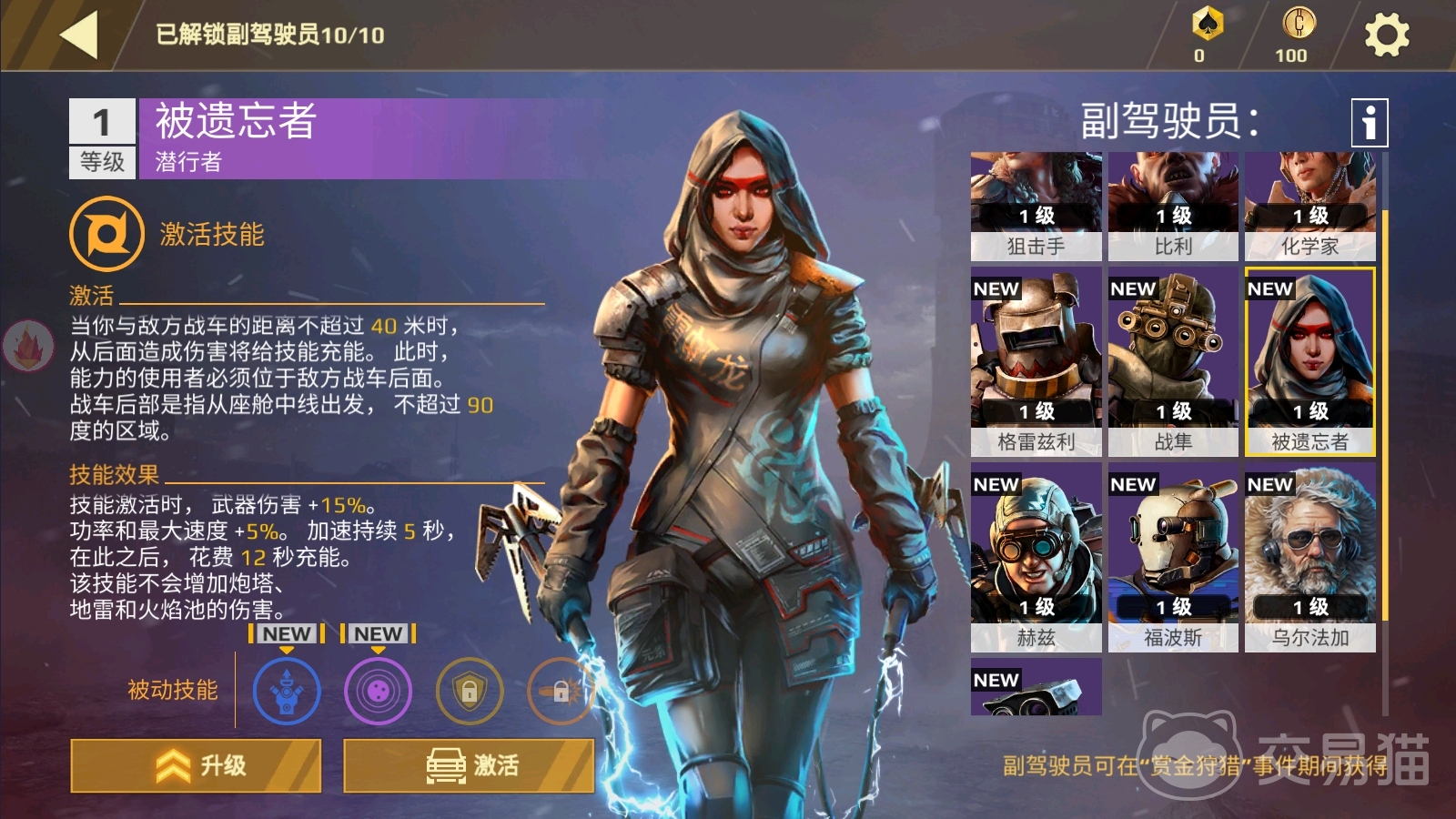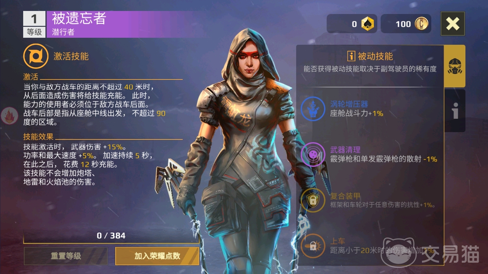 被遗忘者是一个史诗级别的驾驶员,所以在上面是有四个被动技能可以慢慢解锁的,越是品质高的驾驶员其实被动能力获取上面越容易,且效果越好,被遗忘者的第一个被动技能就是涡轮增压器,在上面解锁后可以造成座舱战斗力+1%的效果,相当于是给玩家带来输出增值的效果,其次第二个被动效果即时武器清理,解锁后获得霰弹枪和单发霰弹枪的散射-1%的效果,这个效果其实就比较有针对性的,大家需要自己使用的这个战车是霰弹枪输出方式的才会有这个被动的加成哦。