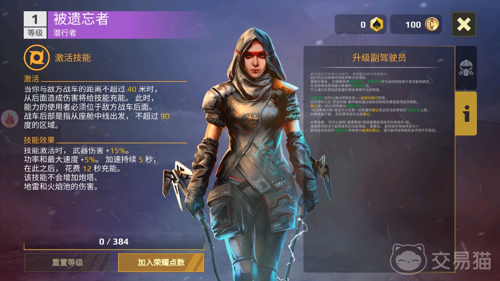 今天介绍的这个副驾驶员是一个女性驾驶员,在能力上面不可小看,名字叫做被遗忘者,在游戏当中只要被激活就有技能可以使用,激活的技能就是当大家的战车与敌方战车的距离不超过40米时,将从后面造成伤害,在造成伤害还可以给自己的技能充能,此时能力的使用者必须位于敌方战车后面,战车后部是指从座舱中线出发,不超过90度的区域,所以在使用这各驾驶员的时候在范围上面是需要大家把握一下的,如果是轻型的带狙击类的战车可能是不太适合的。