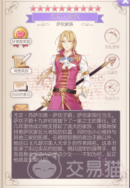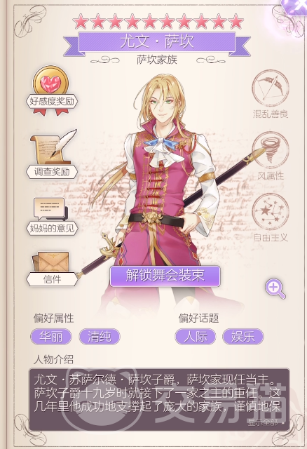 玩家可以选择的换装游戏很多,但是比较偏向于宫廷设定的换装游戏是非常少见的,螺旋圆舞曲除了可以聊天之外,还能邂逅很多不同的角色,可以不断提升这些角色的喜爱度,然后从他们那里收集情报,螺旋圆舞曲尤文介绍分享给大家,通过这些介绍可以了解这个角色,这样攻略起来会变得更简单。