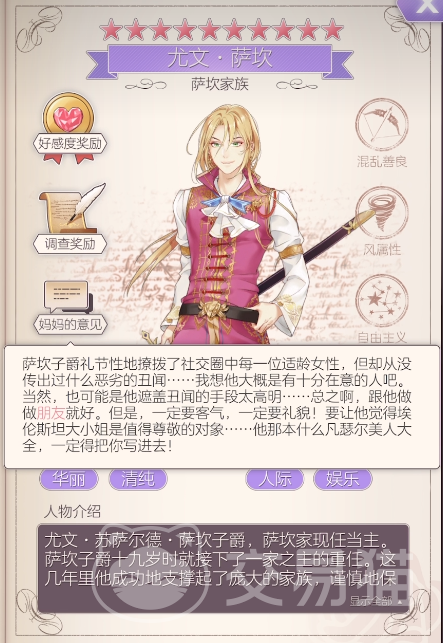 如果想吸引这个角色,那就需要在游戏里选择比较华丽清纯的服装,在对话过程中,都是比较偏向于人际和娱乐的,通过这个人物的背景,玩家也能了解到角色很有自己的头脑,所以任何事情都是以自己为主,在政策方面相对是比较文明开化的,虽然角色是一个家族的领导者,但是关于阶级之间的话题,角色一般都会比较公平的见解,甚至还会偏向于弱势群体。