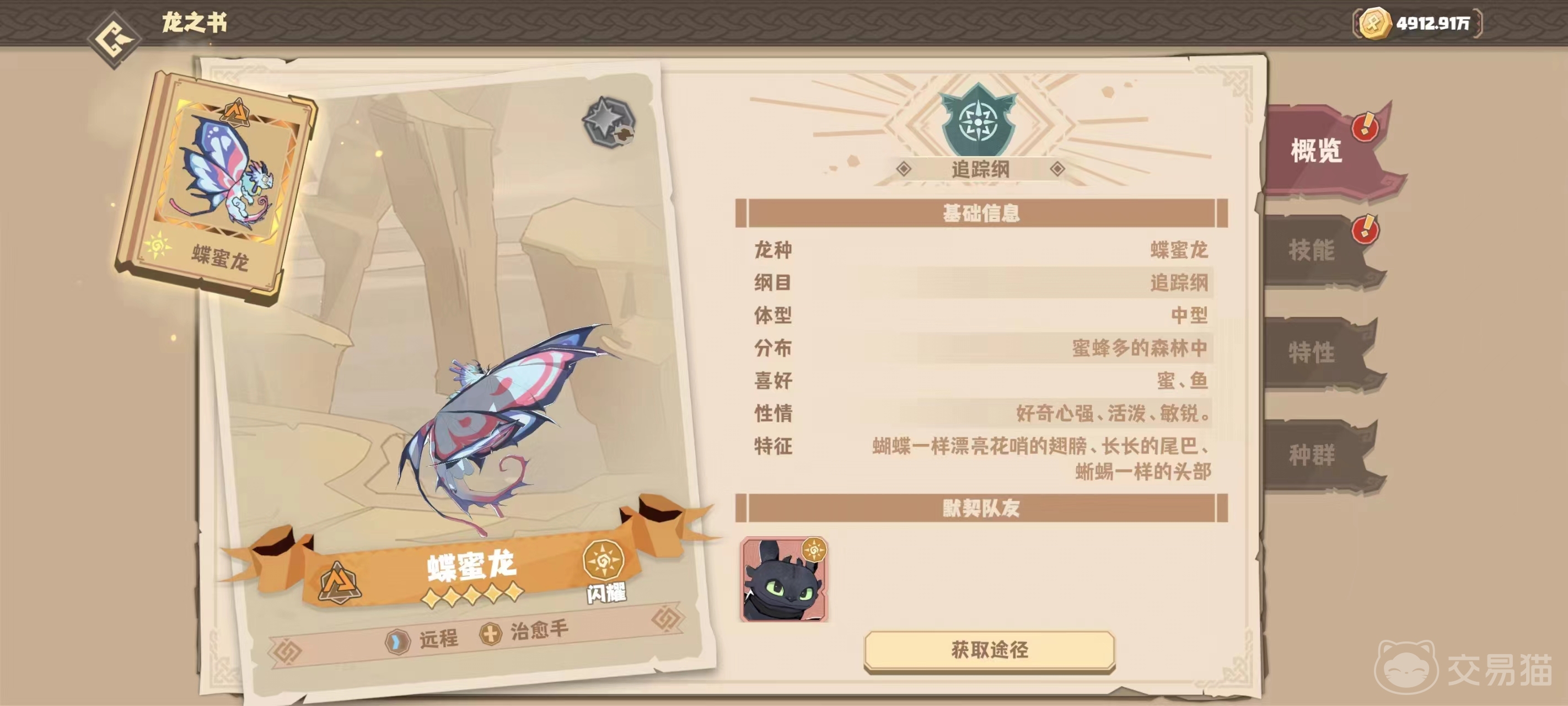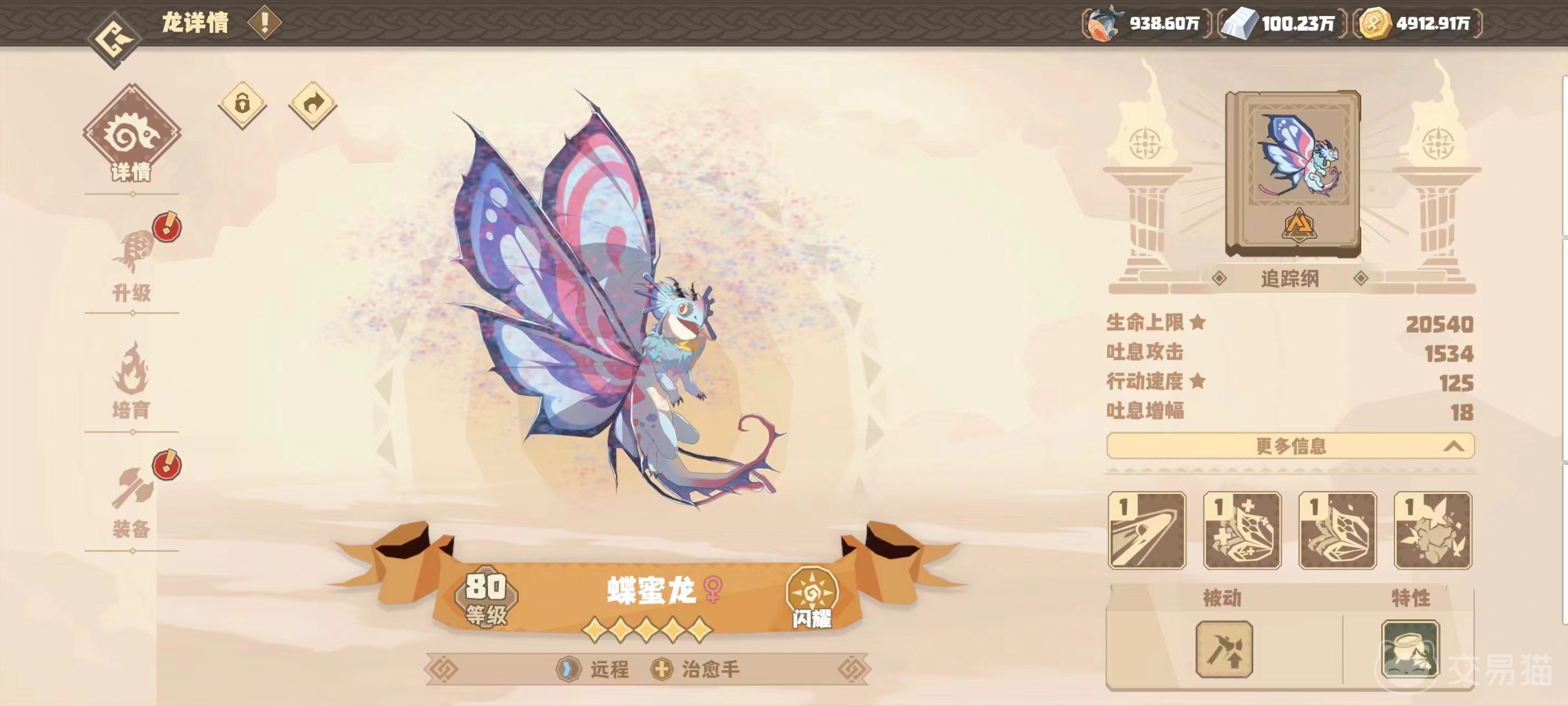 蝶蜜龙:这是一只闪耀元素的治愈受,本身品质也有金色水平,属性以生命与速度最为突出,尤其是速度,这使得它在给队友回血时先手等级能够更高,普攻单体75%吐息攻击加成的一次单体伤害不必多说,技能方面它有两个回血和一个控制,其中一技能是两次单体回血,每次都能够给队友回复6.3%的血量,绝招则是群体回血,可以给全体友军回复16.2%生命上限的血量,并且之后还会施加持续八秒的蜜蜡状态,该状态会在友军受到攻击时恢复蝶蜜龙的血量,另外蝶蜜龙的二技能还可以打AOE伤害并眩晕范围内的多名敌人。