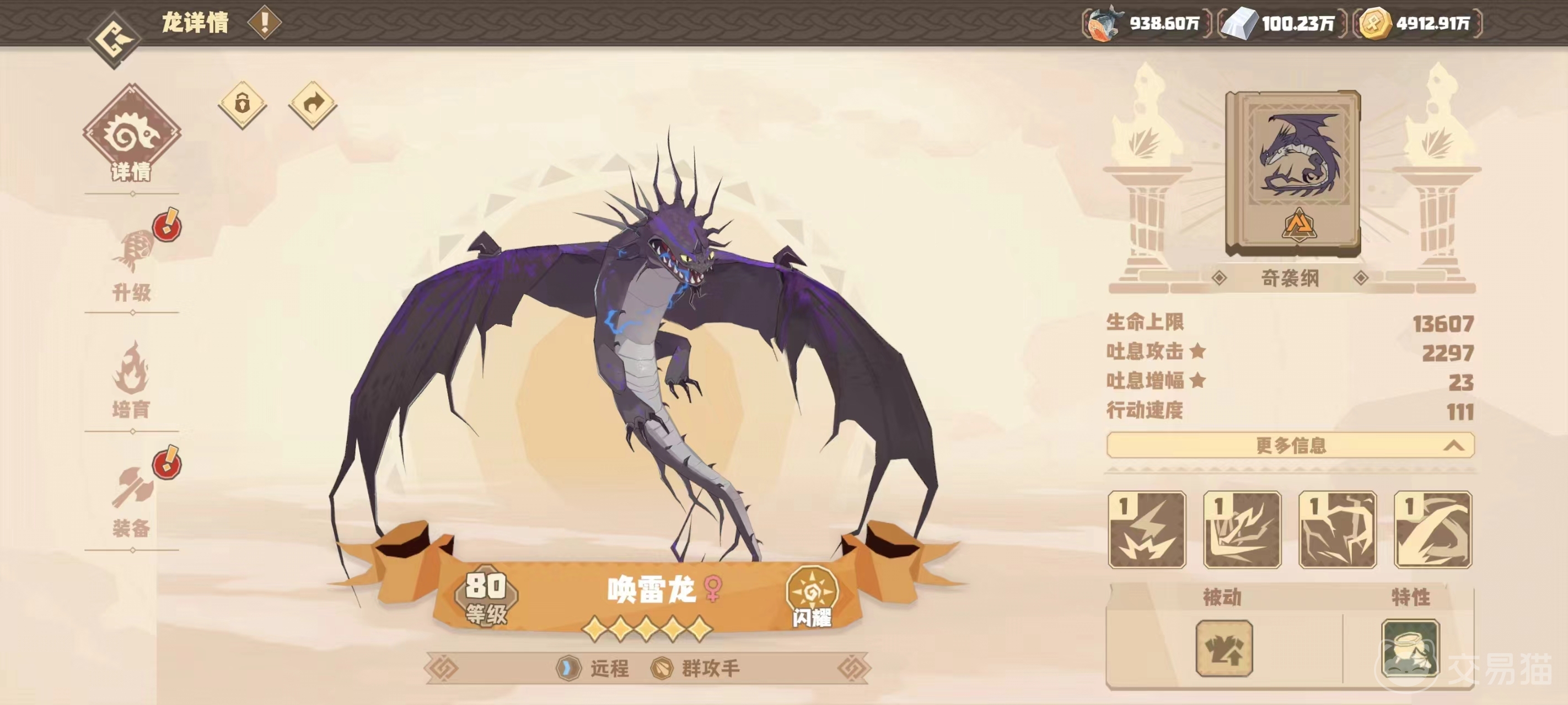 唤雷龙:它是远程群攻手,品质也有五星金色,属性最具优势的是吐息攻击和吐息增幅这两项,它普攻和技能正好能够吃到吐息攻击的加成,所以伤害得以提升。
