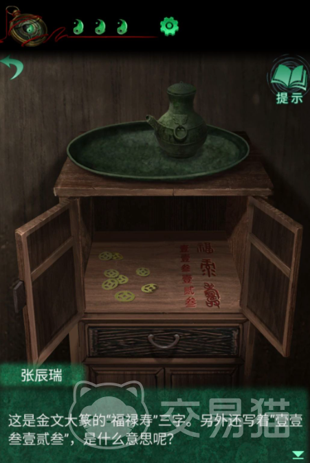 玩家在遇到棺材这个谜题的时候,已经来到第三关最后尾声的部分。到院子之后,首先玩家要点击右边的柜子进行寻找线索,这个地方非常关键。在这里玩家会看到用金文写的福禄寿三个字,并且在旁边还写着113123的数字。这个线索玩家要记住是玩家在后续打开关材的重要钥匙。